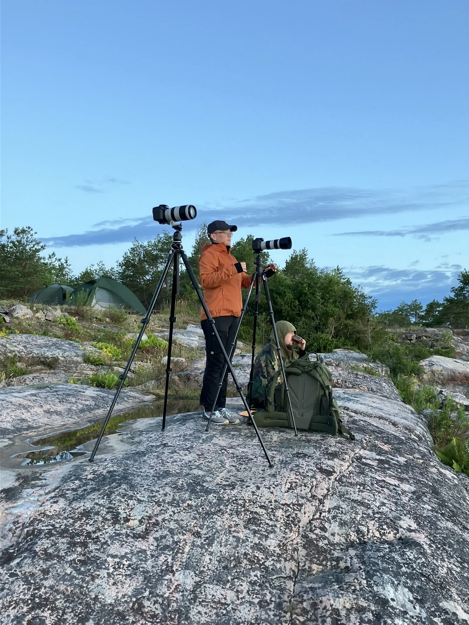 Med en morgonpigg man kan frun kliva upp till färdigt kaffe. Och morgonkaffe i en tyst skog med gott sällskap är verkligen en bra grej……som måste förevigas för ev utlägg socialt.
